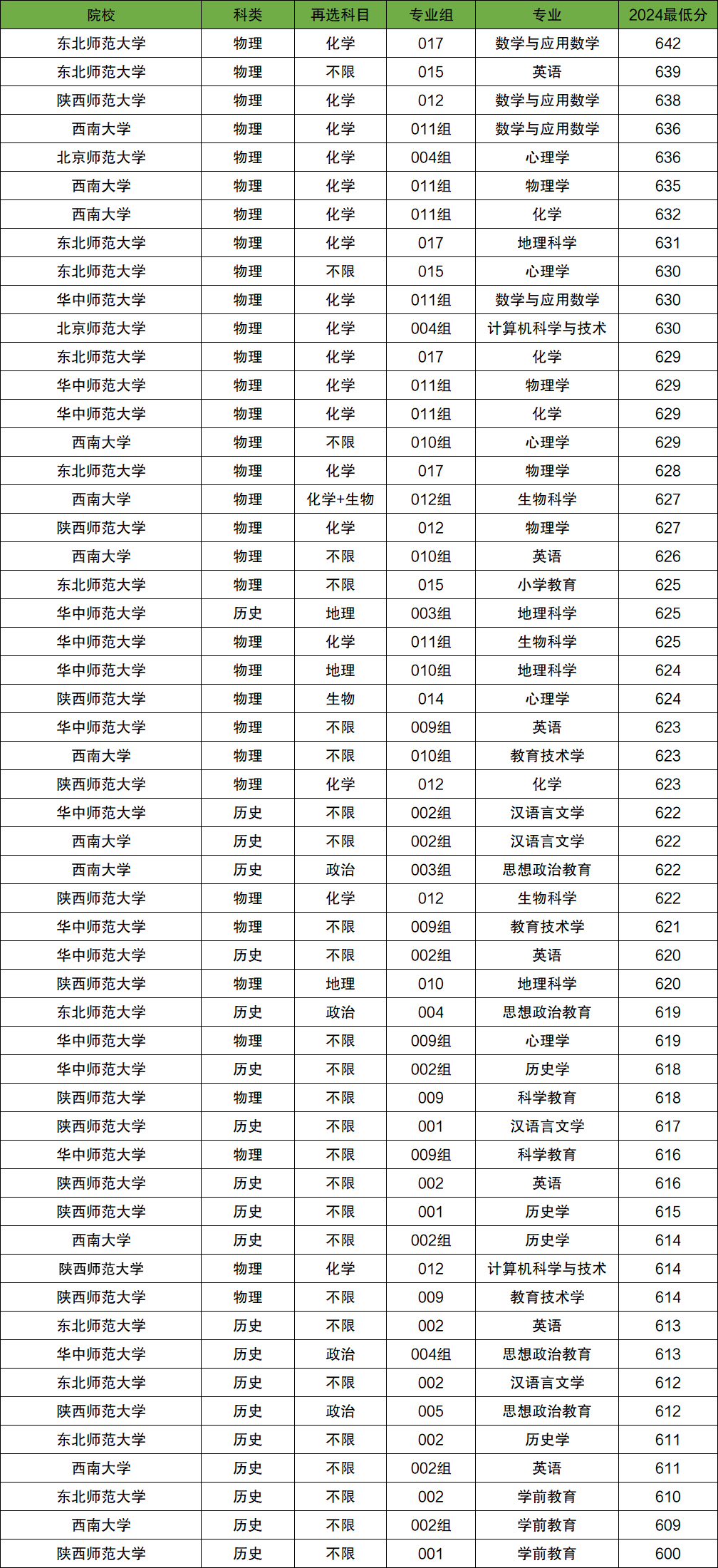 有东北师范大学(历史类最低610分)、华中师范大学(历史类最低613分)、北京师范大学(物理类最低630分)、陕西师范大学(历史类最低600分)等。