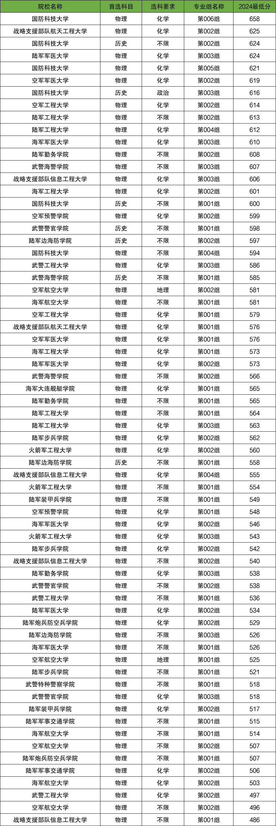 军校有国防科技大学(历史类最低600分、物理类最低594分)、陆军军医大学(物理类最低534分)、武警警官学院(历史类最低598分、物理类最低518分)、海军工程大学(物理类最低573分)、空军工程大学(物理类最低579分)等。