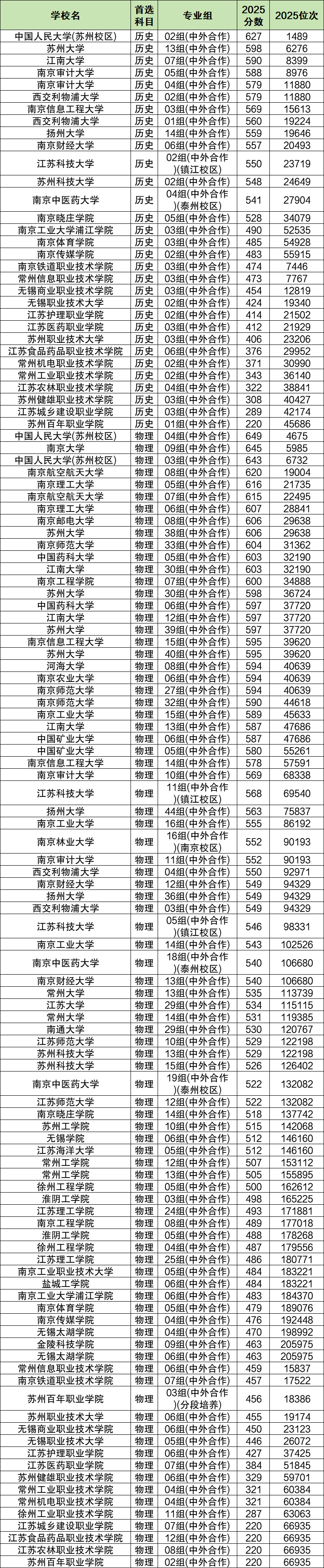 2025年历史组江苏省内高校中外合作办学分数线:220分到627分,最低分学校是苏州百年职业学院(01组)、最高分学校是中国人民大学(苏州校区)(02组);