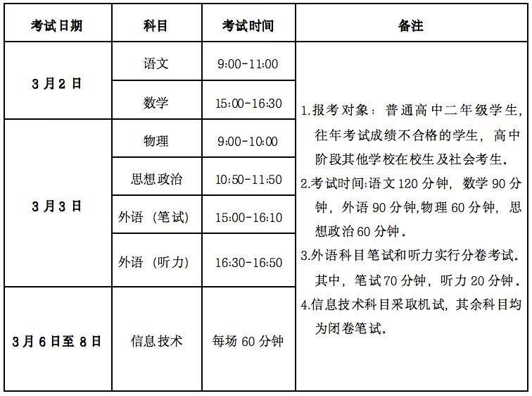 考试科目:普通高中学业水平考试科目为语文、数学、外语、思想政治、历史、地理、物理、化学、生物学、信息技术等10个学科。