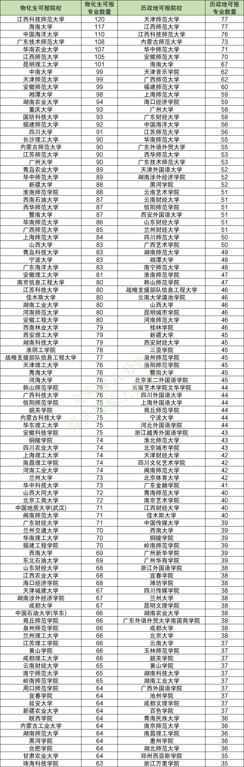 如江西师范大学物化生可报105个专业,历政地只能报77个专业;山西大学物化生可报83个专业,历政地可报46个专业;韩山师范学院物化生可报76个专业,历政地可报47个专业等。