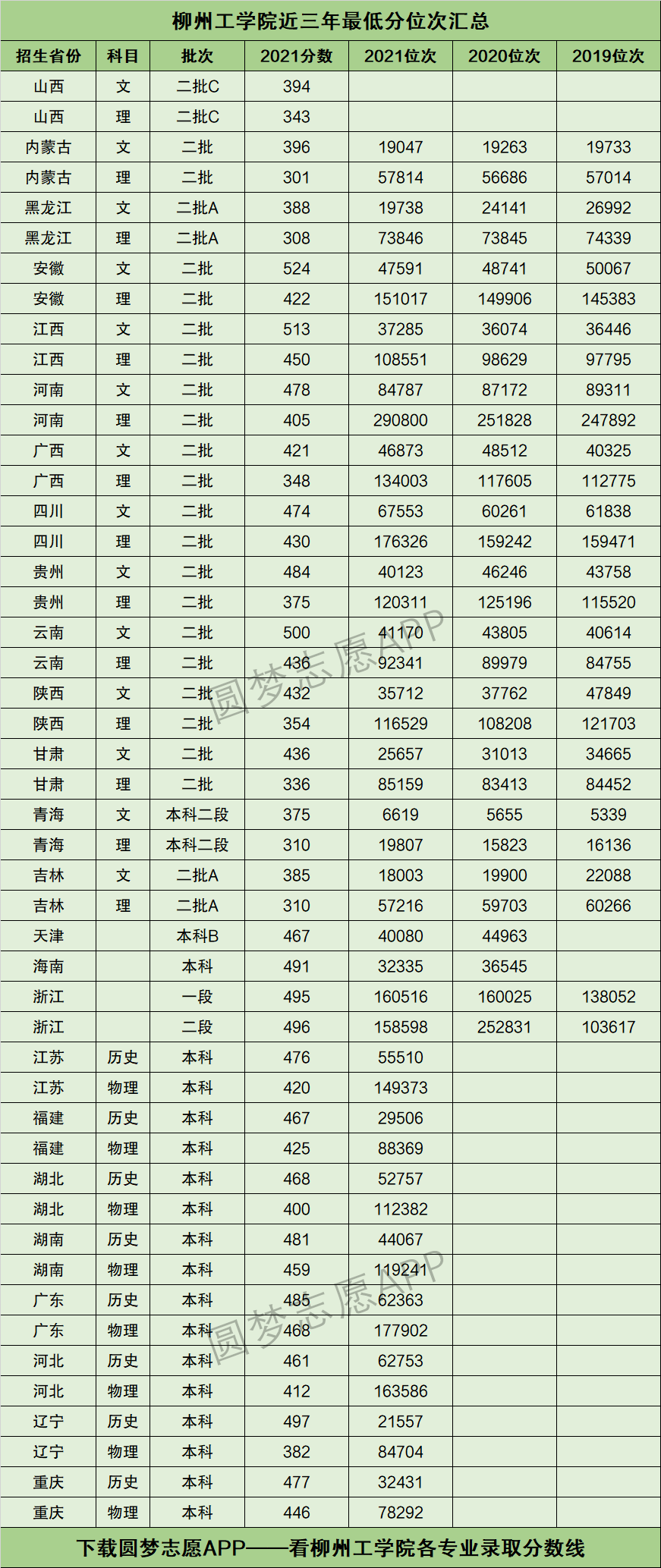 下图为柳州工学院在全国各个省市2019年~2021年的最低分位次表数据,供参考↓