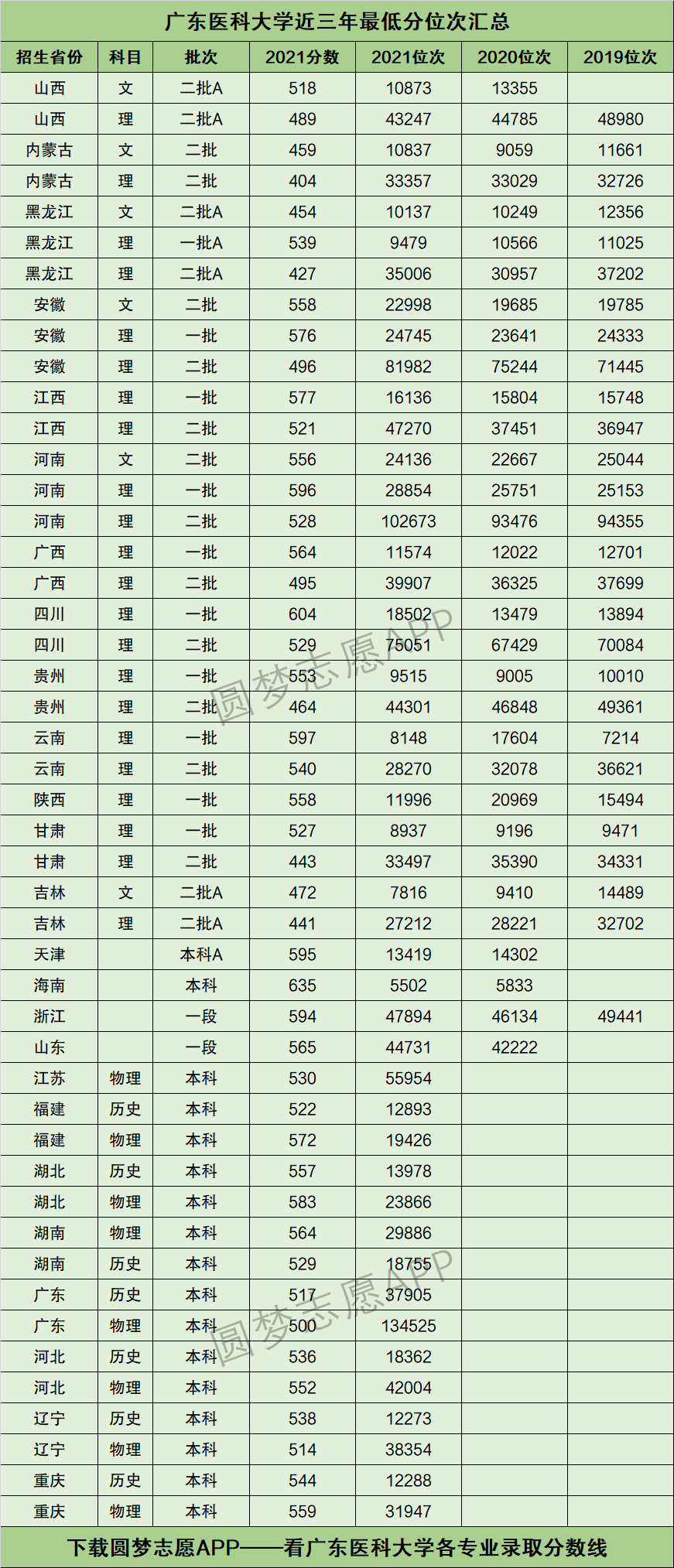 下图为广东药科大学在全国各个省市2019年~2021年的最低分位次表数据,供参考↓