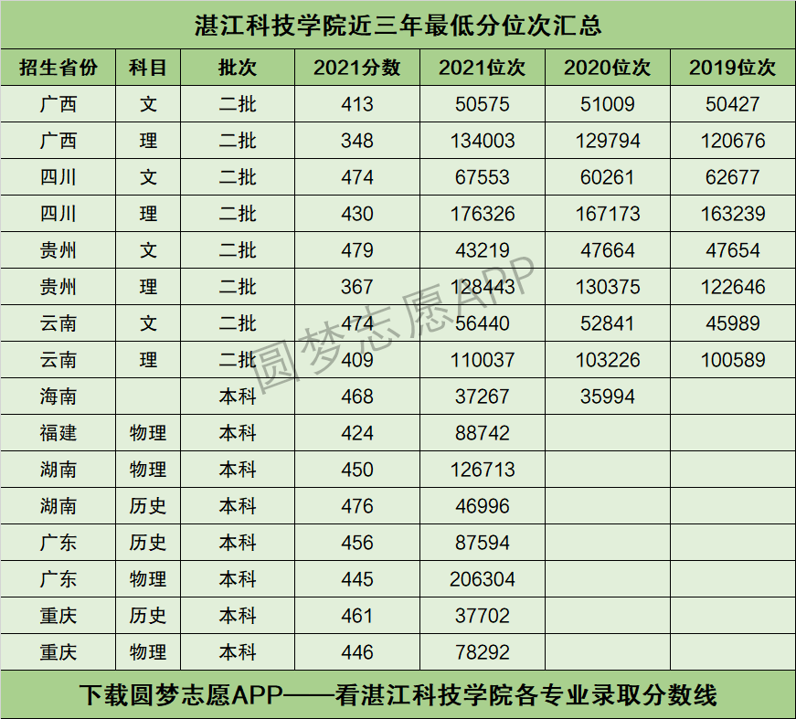 下图为湛江科技学院在全国各个省市2019年~2021年的最低分位次表数据,供参考↓