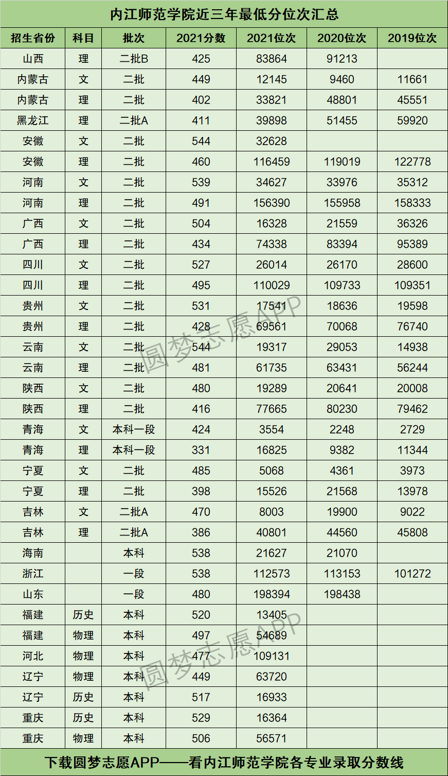 下图为内江师范学院在全国各个省市2019年~2021年的最低分位次表数据,供参考↓