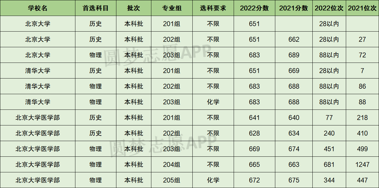 根据广东省教育考试院公布的2022年广东高考本科批分数线,圆梦志愿为大家整理了清华大学、北京大学在广东省的所有分数线,以及清华大学、北京大学近两年在广东省的录取位次。具体数据见下图: