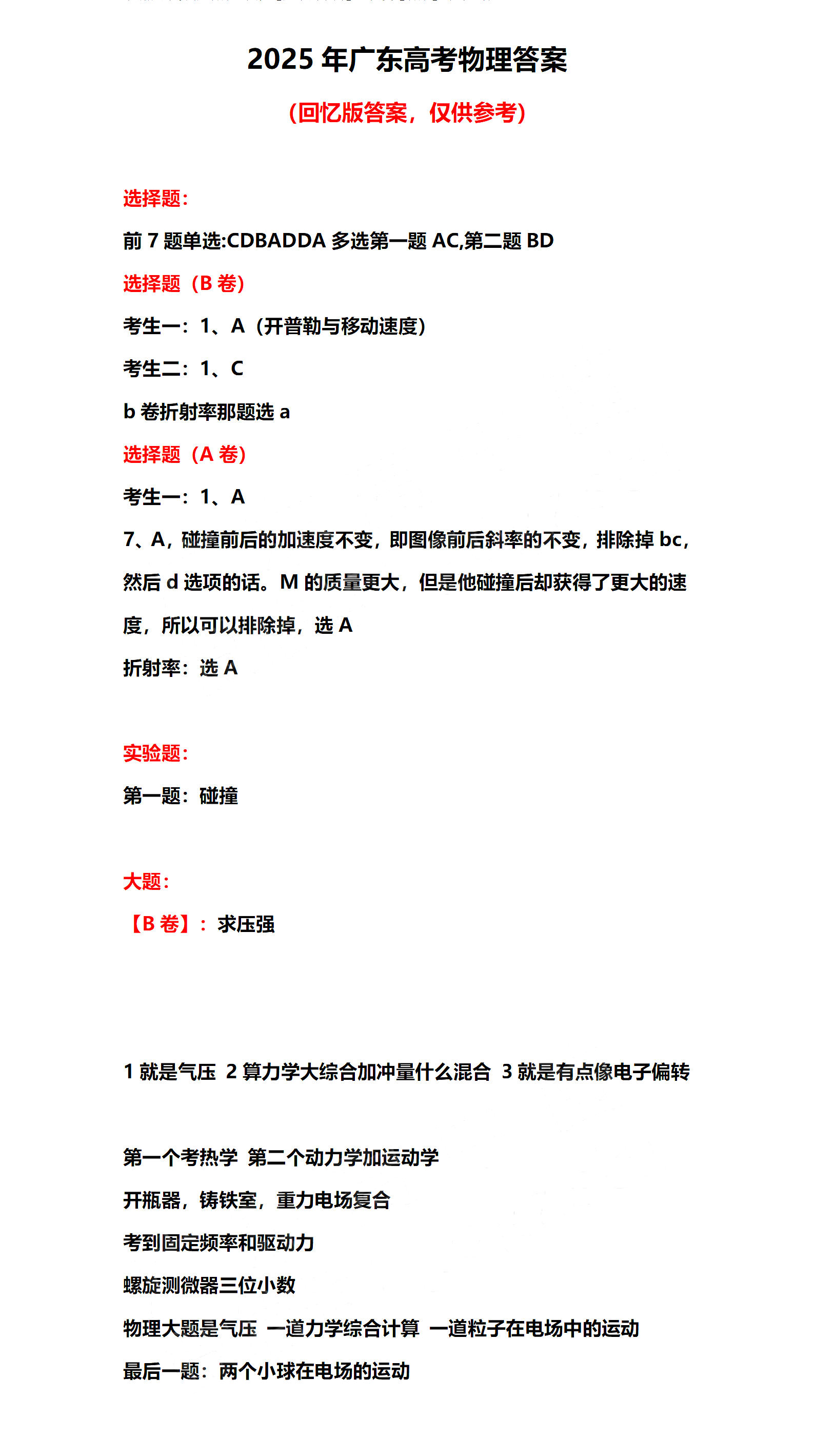 2025年广东高考物理科目于6月8日10:15考试结束,本文将及时收集整理此次考试的真题及参考答案,以便考试结束后,同学们可前来查阅核对答案,预估该科目分数。
