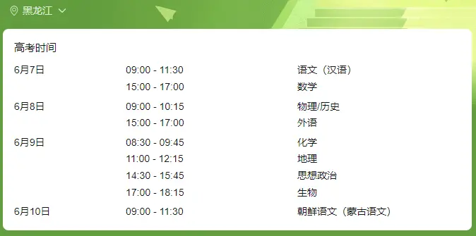 黑龙江2025年高考时间安排在6月7日-6月10日,全国统考科目(语文、数学、外语)考试时间与其余省份一致,在6月7日-8日;选考科目考试时间由黑龙江教育考试院安排在了6月8日-9日。