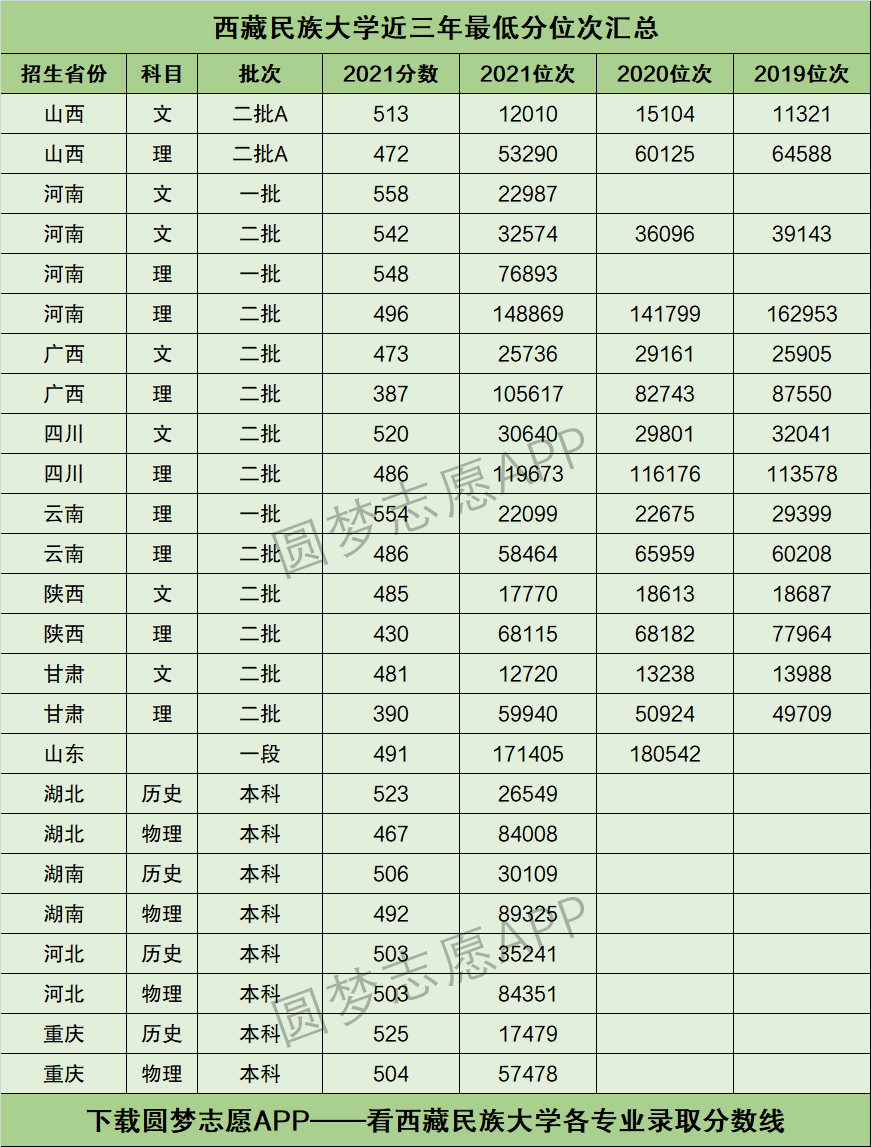 根据圆梦志愿APP提供的数据,西藏民族大学2021年在陕西省本科二批文科考生中录取的最低分为485分、最低分位次为17770名;在理科考生中录取的最低分为430分、最低分位次为68115名。