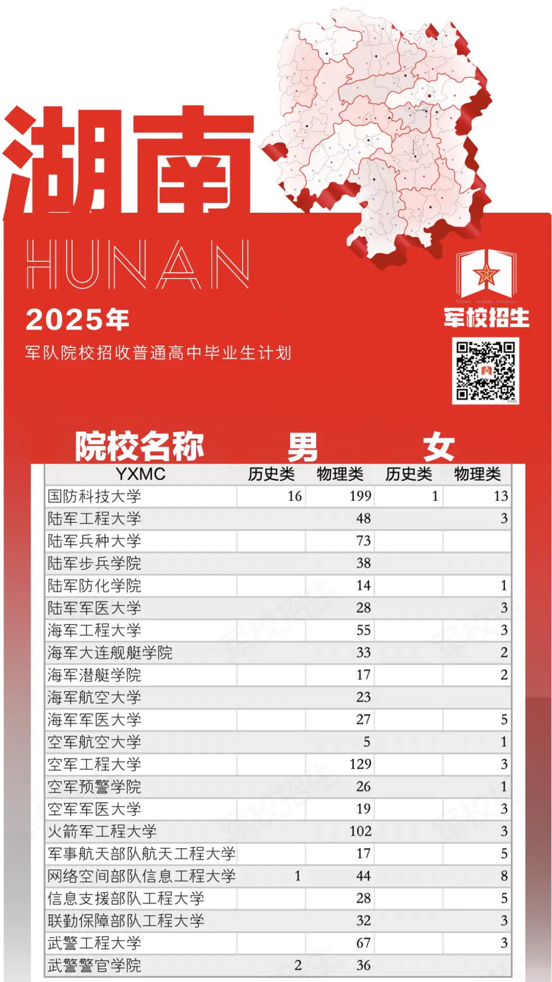 2025年湖南军校招生院校有国防科技大学、陆军工程大学、陆军兵种大学、陆军步兵大学、陆军防化学院、陆军军医大学、网络空间部队信息工程大学等。