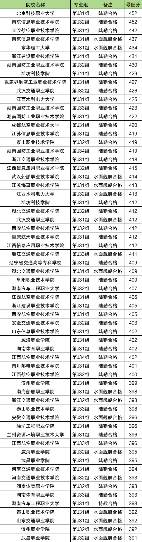 分数线最低的院校专业组:武昌职业学院(第J32组),2025年最低投档分为391分;此外分数较低的还有滨州职业学院(第J32组)392分、山东交通职业学院(第J31组)392分、泰山职业技术学院(第J31组)392分。