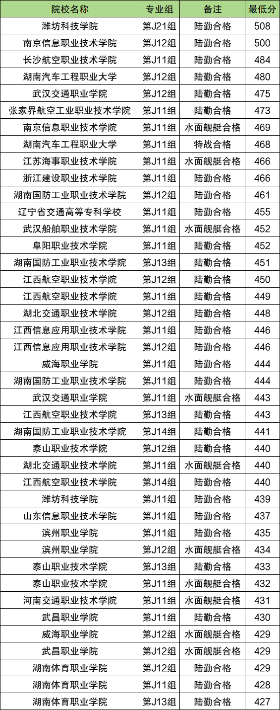 分数线最低的五个院校专业组:湖南体育职业学院(第J13组)427分、湖南体育职业学院(第J11组)428分、湖南体育职业学院(第J12组)429分、武昌职业学院(第J12组)429分、威海职业学院(第J12组)429分。