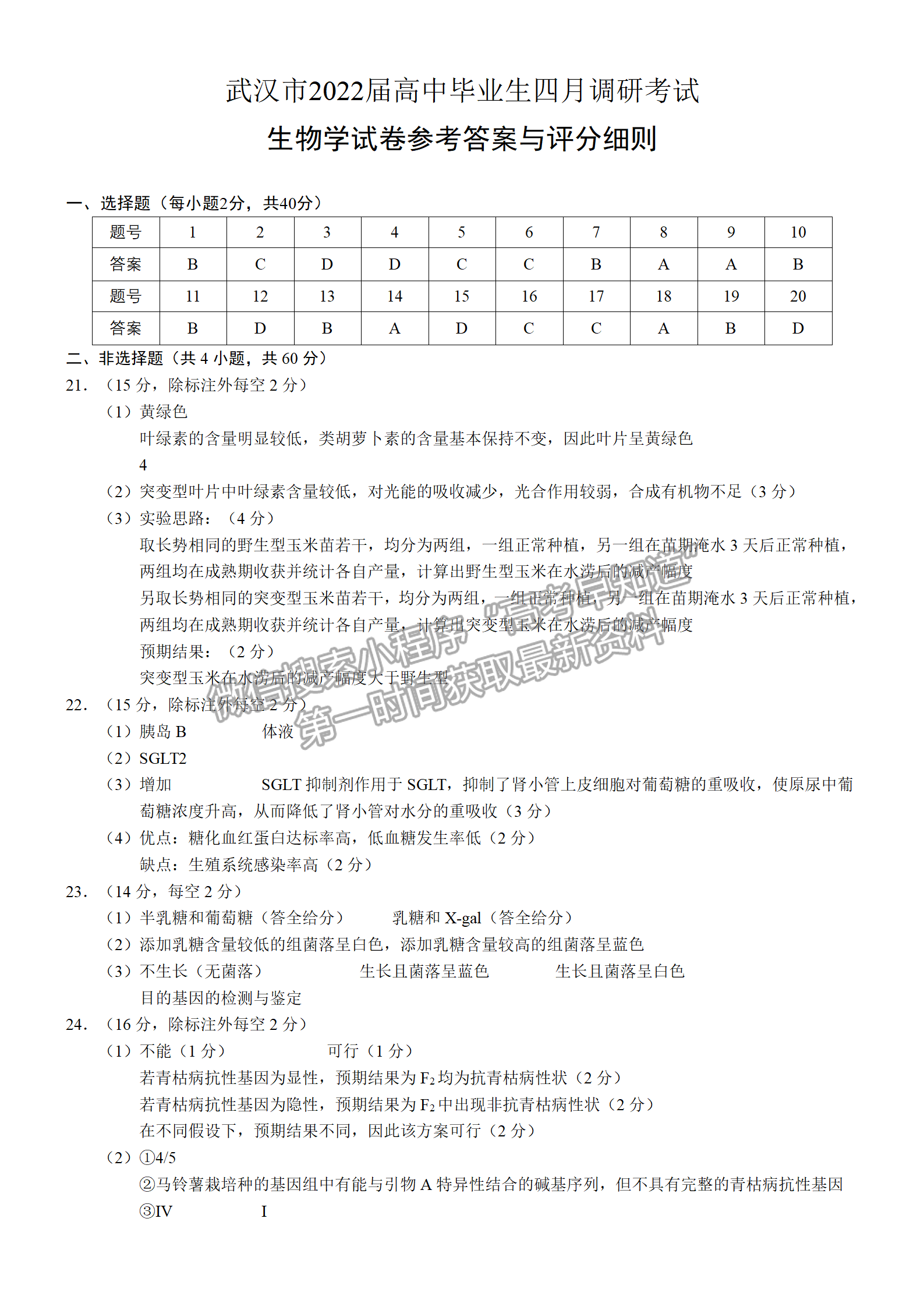 1、2022年武汉高三四调化学生物答案