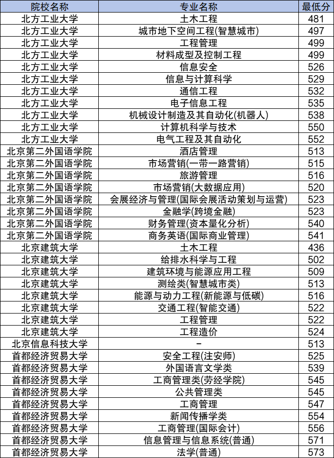 2024年北京建筑大学地方专项计划最低分:436分,分数线最低的专业是土木工程;分数线最高的专业是工程造价;其余各个专业最低分依次是:给排水科学与工程502分、建筑环境与能源应用工程509分、测绘类(智慧城市类)513分、能源与动力工程(新能源与低碳)516分、交通工程(智能交通)522分、工程管理522分。