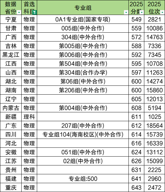 2025年北京邮电大学物理类/理科录取分数线最低是549分,对应的是宁夏0A1专业组(国家专项),排位在2821名。最高分数线是643分,对应的是重庆市,排位在2472名。