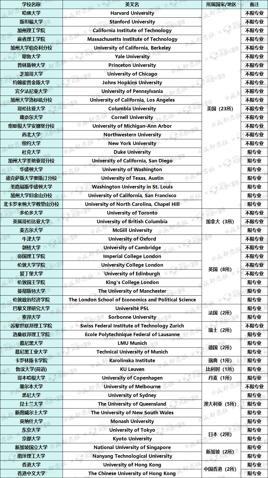 根据四川省相关官网报道,四川省将面向54所境外高校招收选调生,招生学历为硕士研究生及以上学历的毕业生。其中这54所高校由US News、QS、Times、ARWU世界大学最新综合排名确定。
