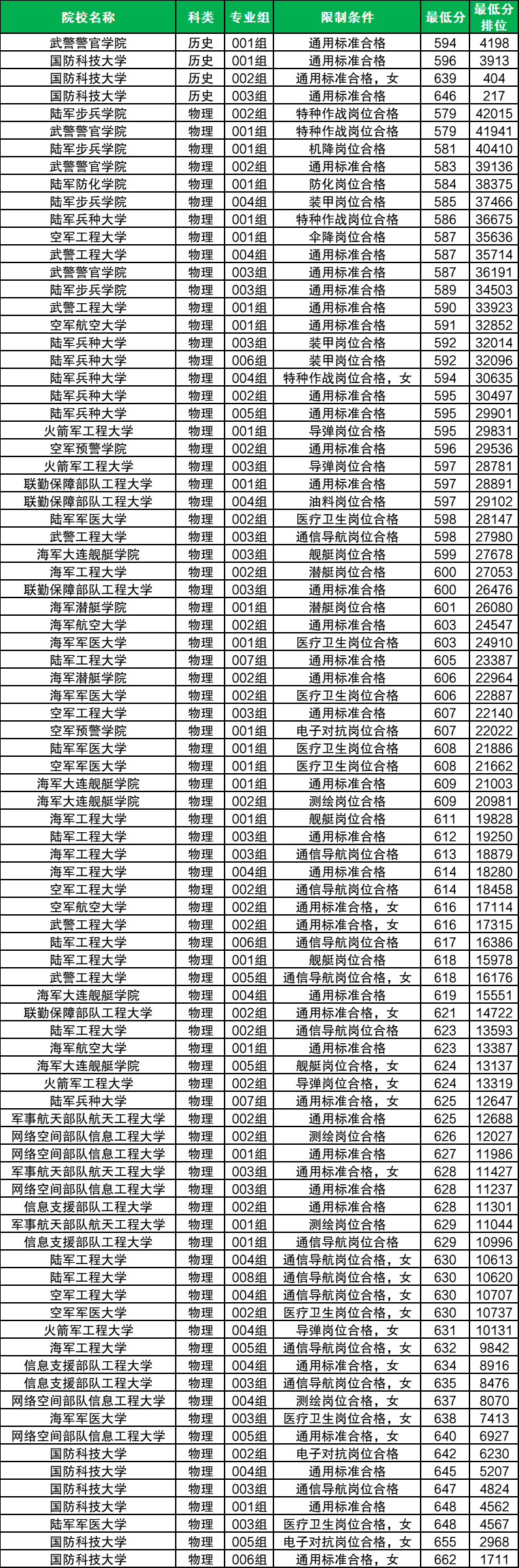 2025年历史类招生军校数量为4所,分数在594分-646分之间不等。这些院校中,招女生的只有1所,最低分为639分(超特控线124分)。历史类女生最容易考上的军校是国防科技大学(002组,通用标准合格)。