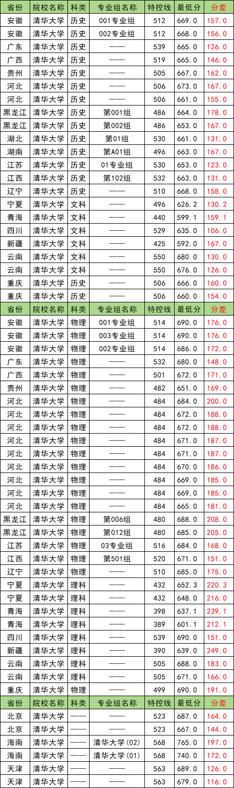 数据显示,清华大学物理类招生分数范围位于601分~690分之间,其中最低分省份为青海省,超特控线212分;最高分省份为安徽省,超特控线176分。历史类招生分数范围位于592分~680分之间,其中在新疆的分数线最低,考生超特控线167分即可被录取。
