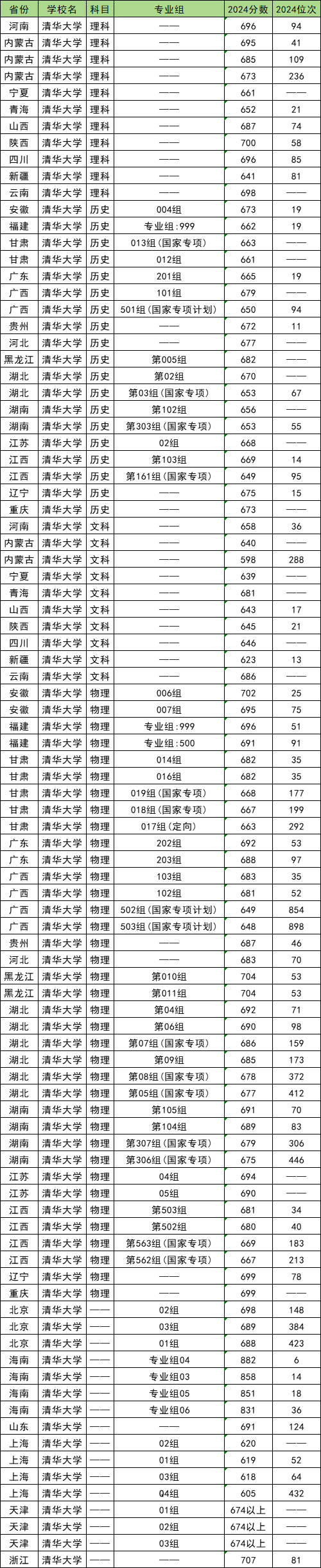 清华大学2025年录取分数线已公布,本科提前批分数各省详情如下: