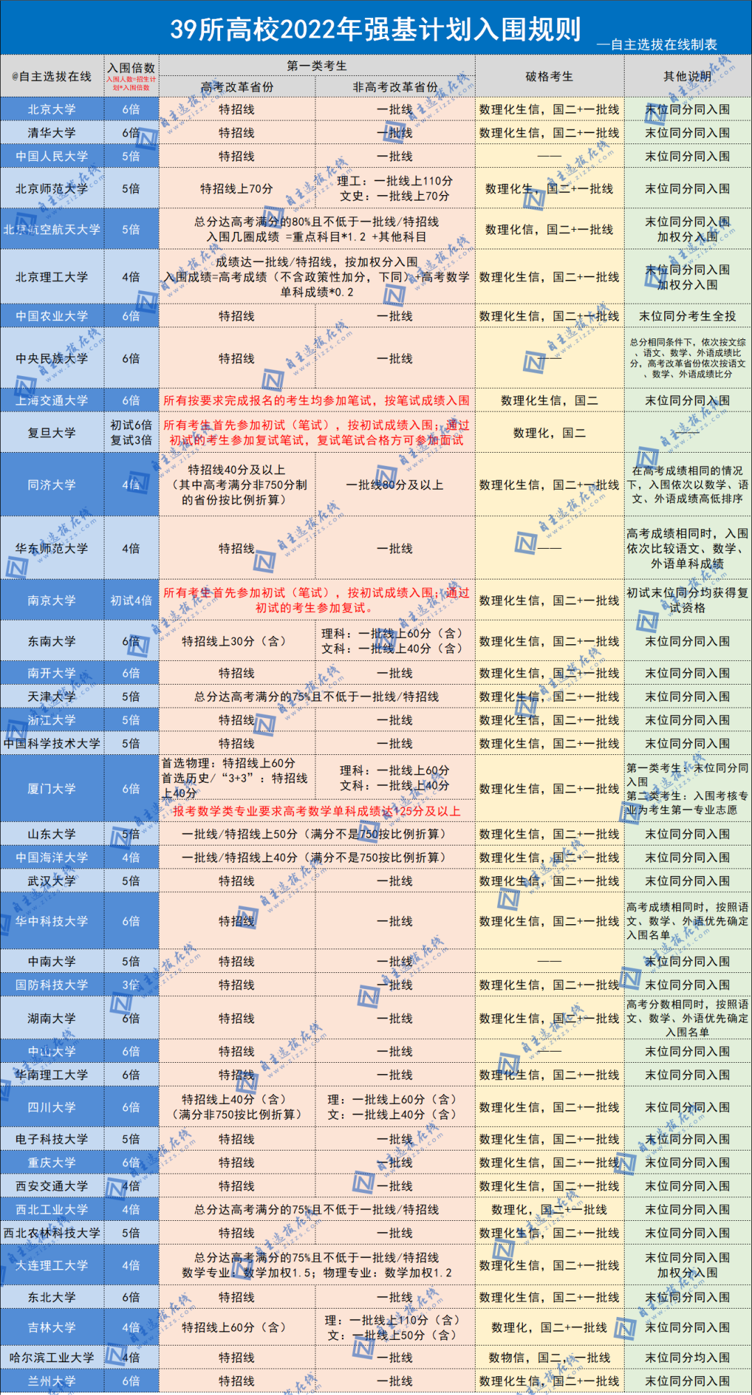 下文为大家附上39所院校2022年强基计划入围规则统计: