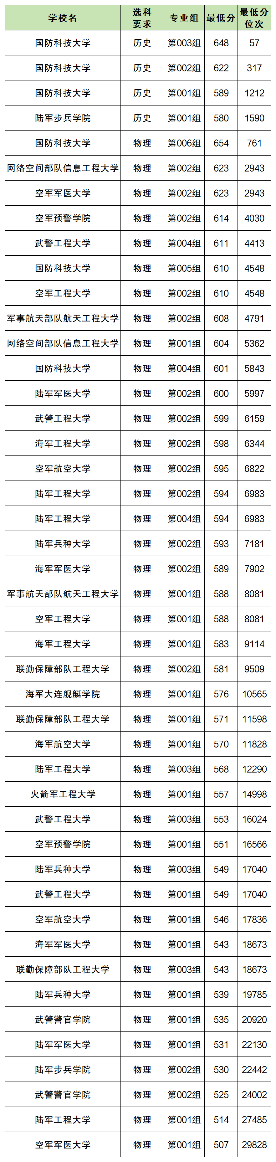 在男生方面,军校分数最低的是空军航空大学03组和海军航空大学02组,2025年的最低分均为520分,选科要求分别是物理+地理、物理+化学;在女生方面,军校分数最低的是军事航天部队航天工程大学02组,2025年的最低526分,选科要求是物理。