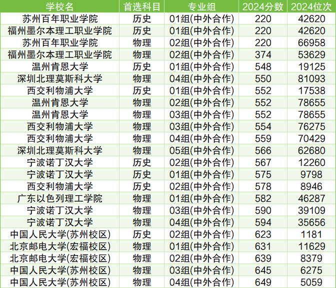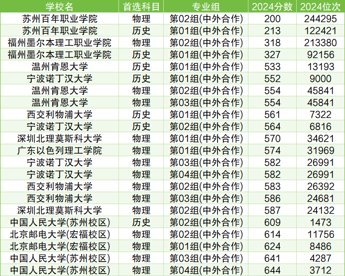 以历史类为例,考生可报考的最低分中外合作大学有苏州百年职业学院(01组(中外合作))、福州墨尔本理工职业学院(01组(中外合作)),2024年最低分均为220分。