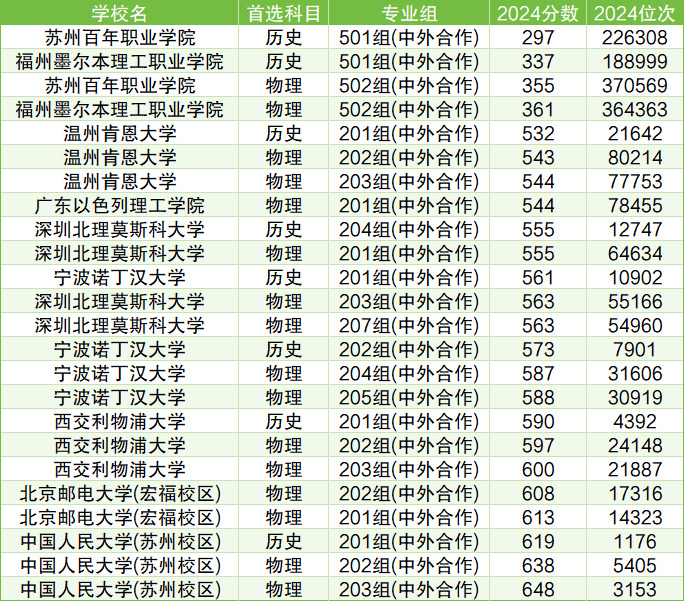 以物理类为例,考生可报考的最低分中外合作大学有苏州百年职业学院(502组(中外合作)),2024年最低分均为355分,位次范围在3153-370569名之间。