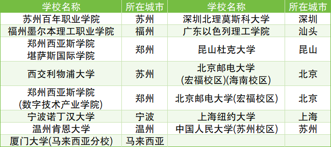 其中本科院校包含:宁波诺丁汉大学、西交利物浦大学、深圳北理莫斯科大学、北京邮电大学(宏福校区)等。