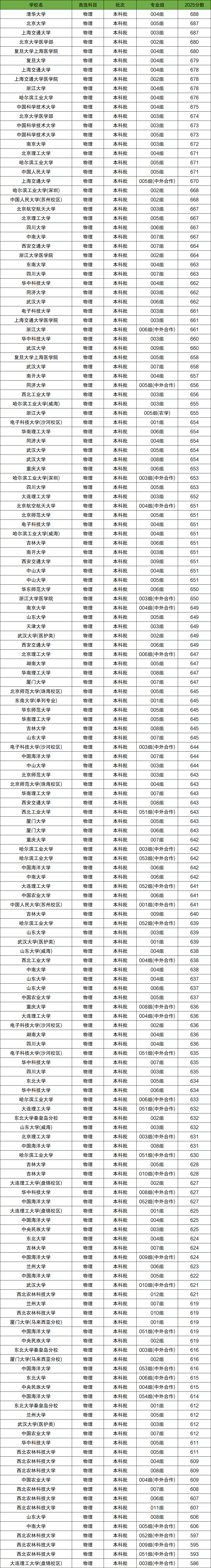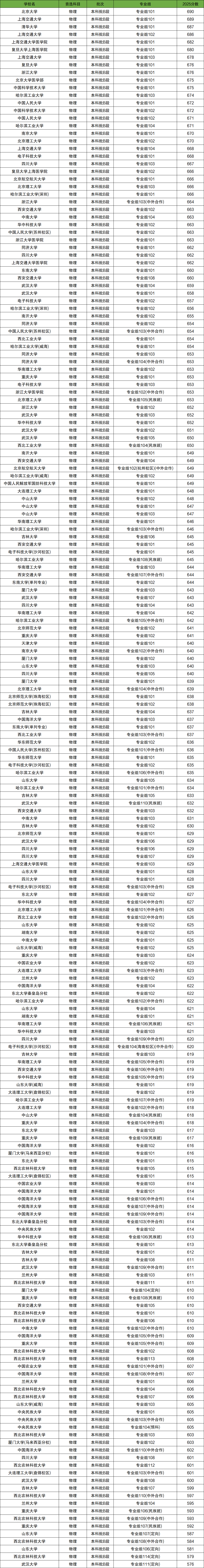 而物理类分数最低的院校是武汉大学(专业组111定向),最低分为576分。分数最高的院校是北京大学(专业组101),最低分为690分。