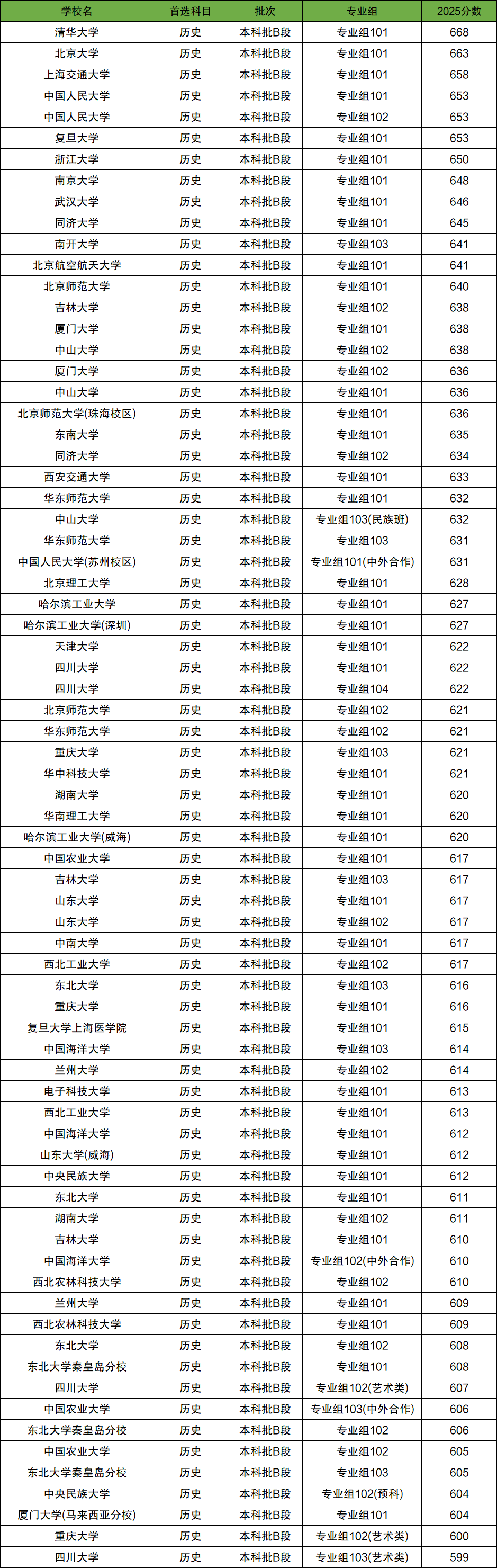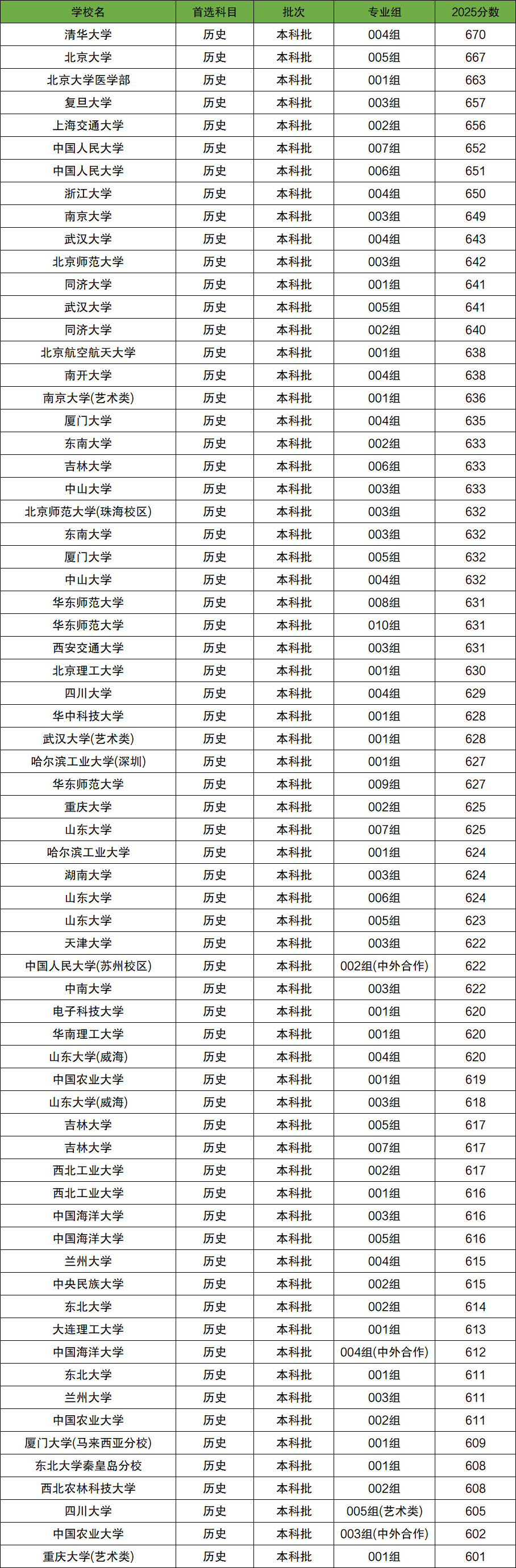 其中历史类分数最低的院校为四川大学(专业组103艺术类),最低分为599分。而分数最高的院校为清华大学(专业组101),最高分为668分。
