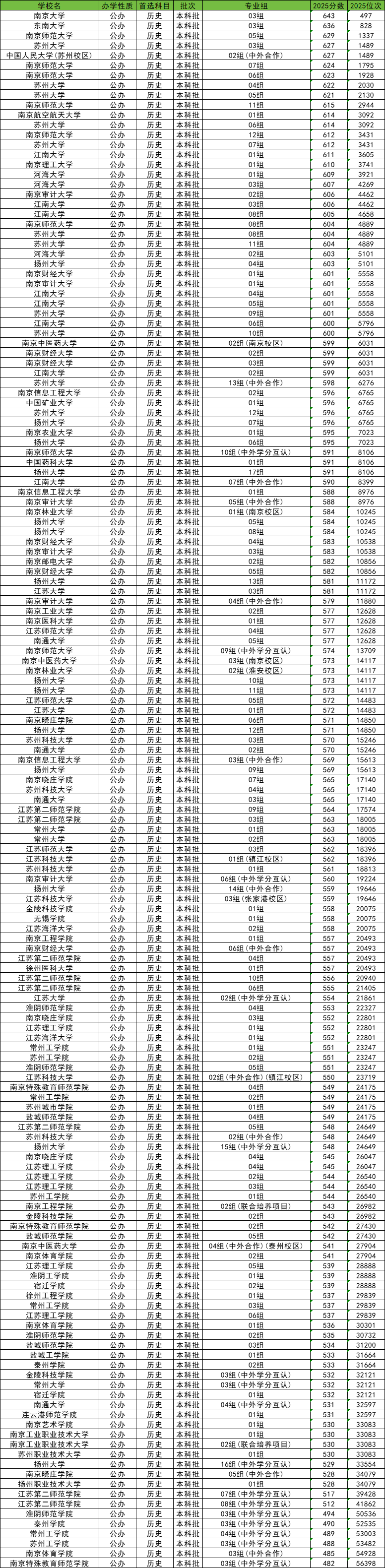 2025年江苏省公办本科大学在江苏本省历史类的分数线为482分-645分之间,历史类录取分数线最高的是南京大学专业组03组,最低分为643分,最低位次为第497名;其次是东南大学专业组03组,最低分为636分,最低位次为第828名。