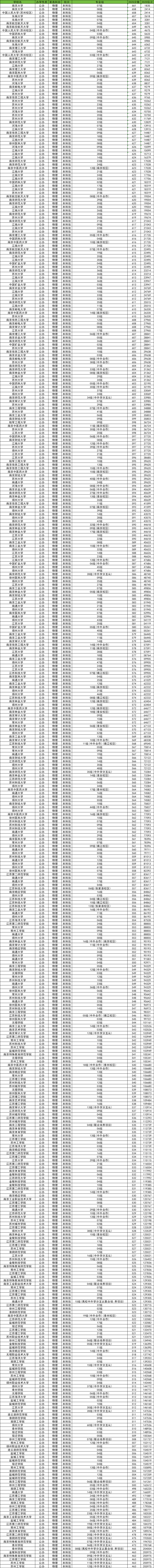2025年江苏省公办本科大学在江苏本省物理类的分数线为463分-661分之间,物理类录取分数线最高的是南京大学专业组07组,最低分为661分,最低位次为第1835名;其次是南京大学专业组08组,最低分为658分,最低位次为第2414名。