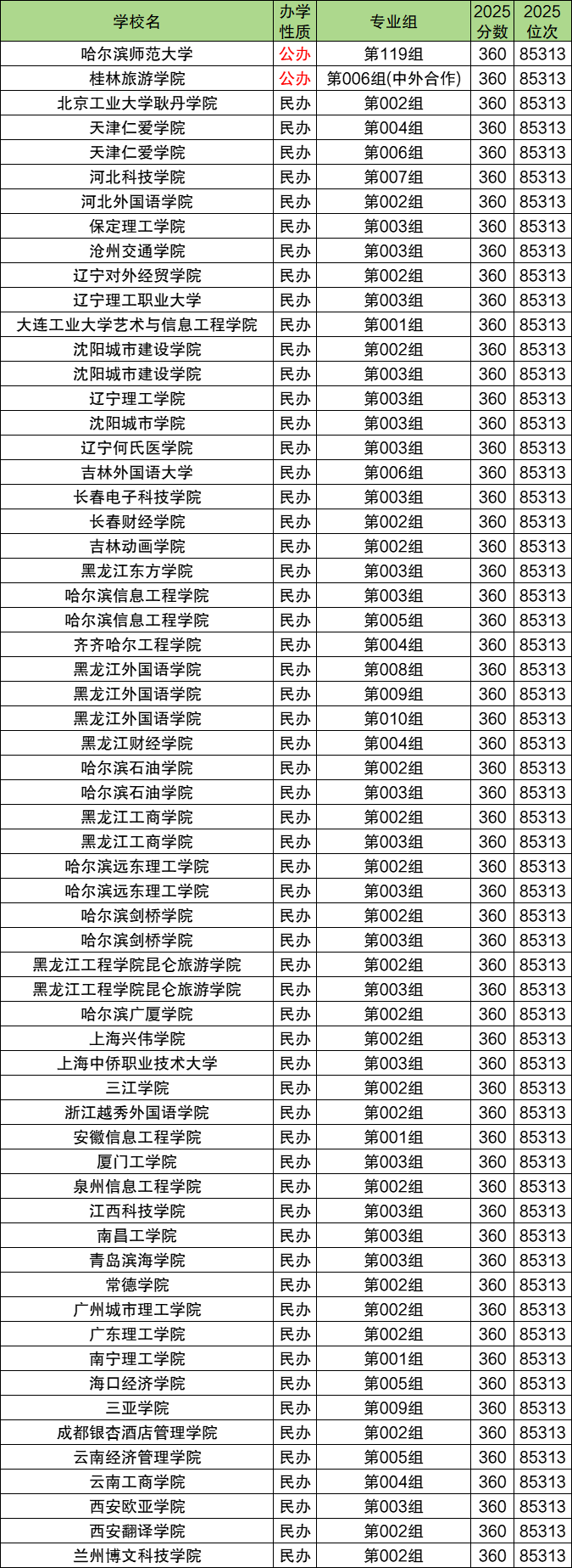 公办大学名单:哈尔滨师范大学第119组、桂林旅游学院第006组(中外合作)。
