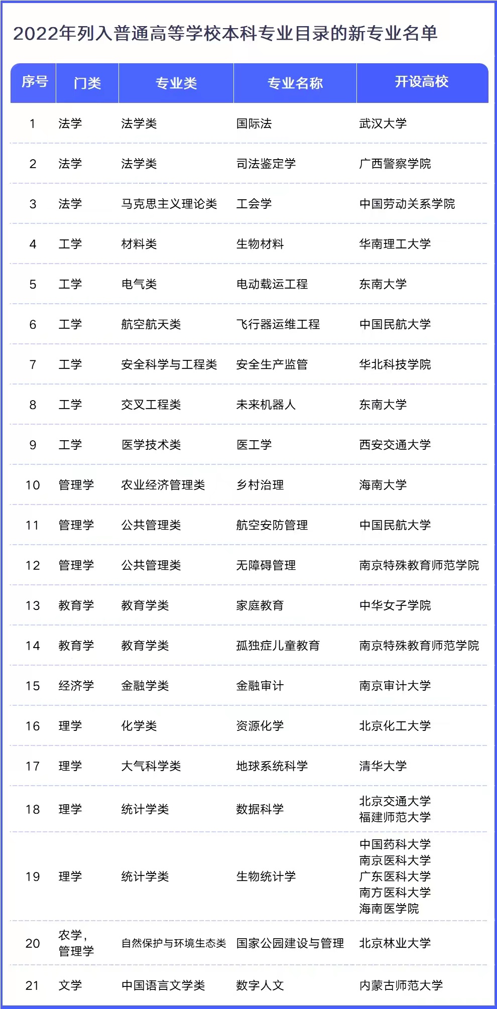 2023年高考共有21个新增的大学专业,涉及到法学、工学、管理学、理学、农学等不同学科门类。