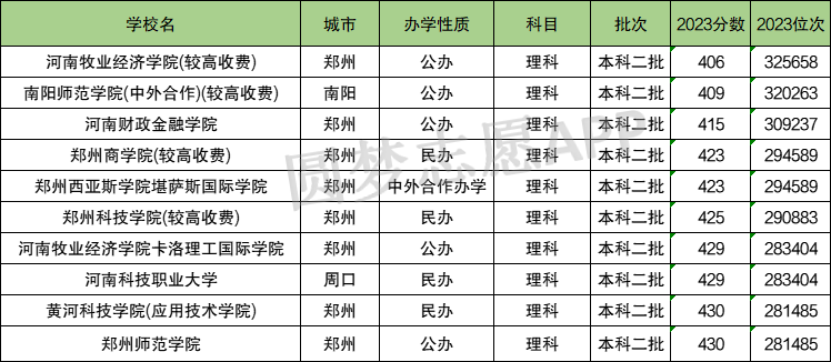 河南牧业经济学院(较高收费)(406分)、南阳师范学院(中外合作)(较高收费)(409分)、河南财政金融学院(415分)、郑州商学院(较高收费)(423分)、郑州西亚斯学院堪萨斯国际学院(423分)、郑州科技学院(较高收费)(425分)、河南牧业经济学院卡洛理工国际学院(429分)、河南科技职业大学(429分)、黄河科技学院(应用技术学院)(430分)、郑州师范学院(430分)。