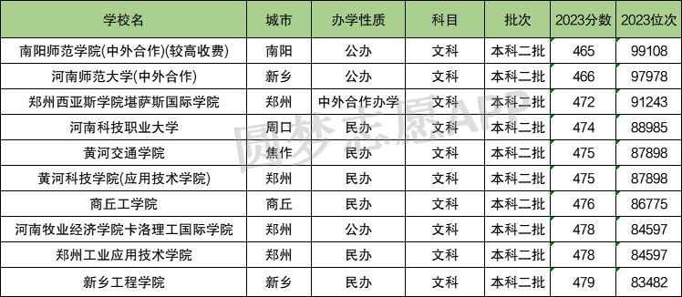 南阳师范学院(中外合作)(较高收费)(465分)、河南师范大学(中外合作)(466分)、郑州西亚斯学院堪萨斯国际学院(472分)、河南科技职业大学(474分)、黄河交通学院(475分)、黄河科技学院(应用技术学院)(475分)、商丘工学院(476分)、河南牧业经济学院卡洛理工国际学院(478分)、郑州工业应用技术学院(478分)、新乡工程学院(479分),以上学校均为民办二本大学。
