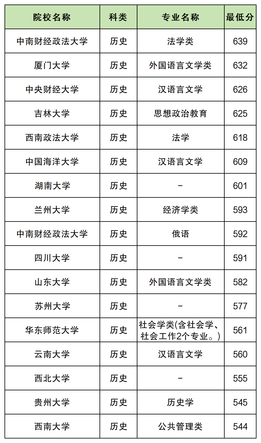2024年各大学高校专项计划在辽宁历史类的录取分数线在544分-639分之间,录取分数最高的是中南财经政法大学(法学类),最低分为639分;最低录取分数超过610分的还有:厦门大学(外国语言文学类632分)、中央财经大学(汉语言文学626分)、吉林大学(思想政治教育625分)等。