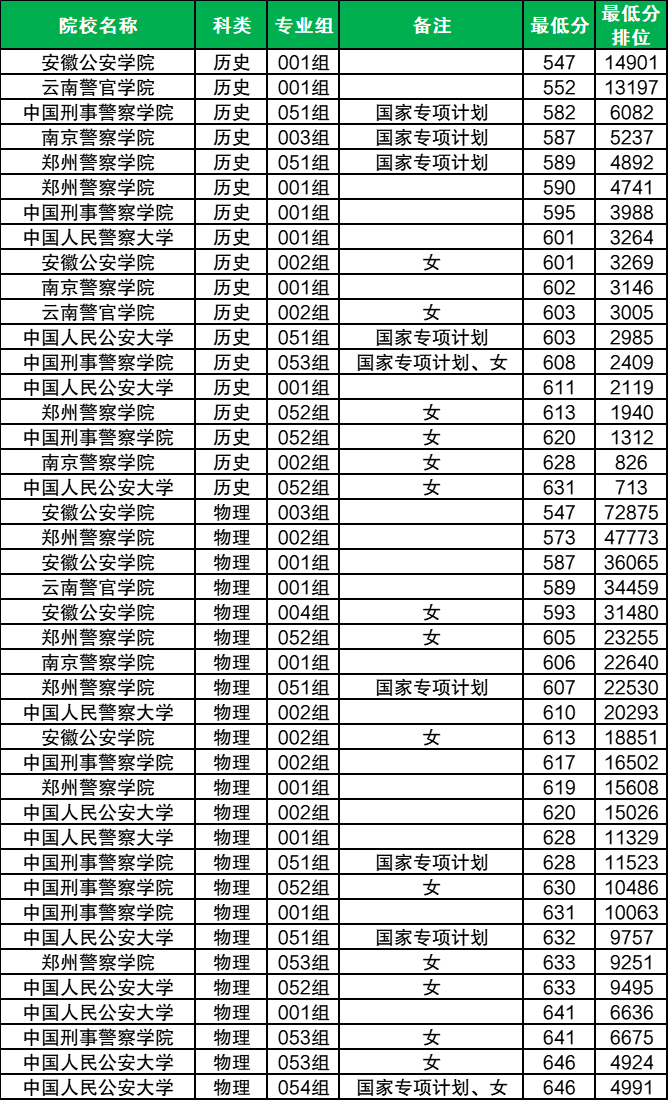 而历史类男生最低超特控线32分即可上公安警校,分数门槛比女生低54分,可报考的最低分公安警校是安徽公安学院,学校001组2025年最低分为547分。