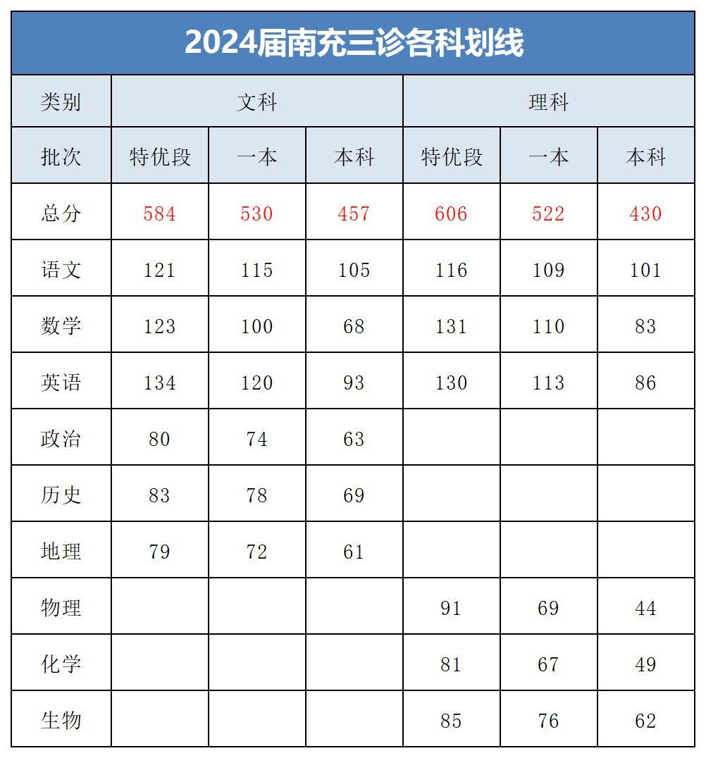 2024南充三诊分数线划线官方已公布,文科特优段(重本线)584分,一本线530分,本科线457分,理科特优段(重本线)606分,一本线522分,本科线430分。