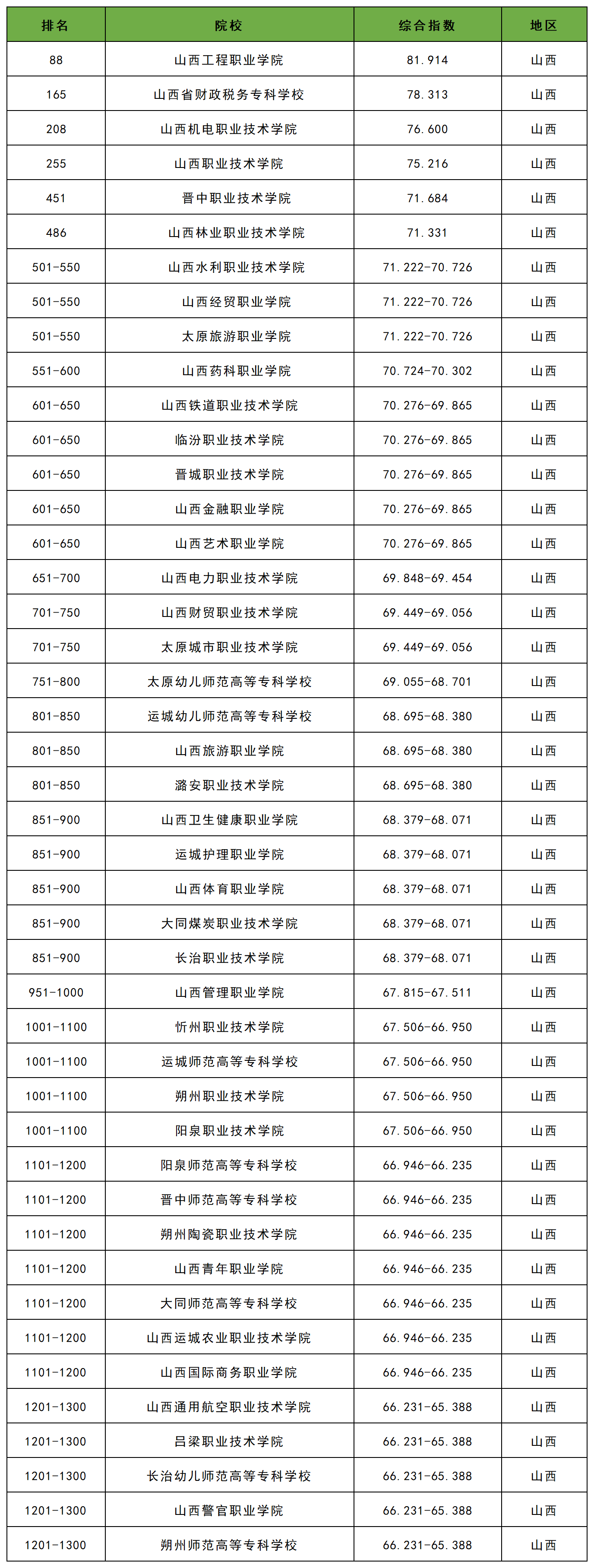 2025年GDI山西省公办专科大学排名前五大学如下: