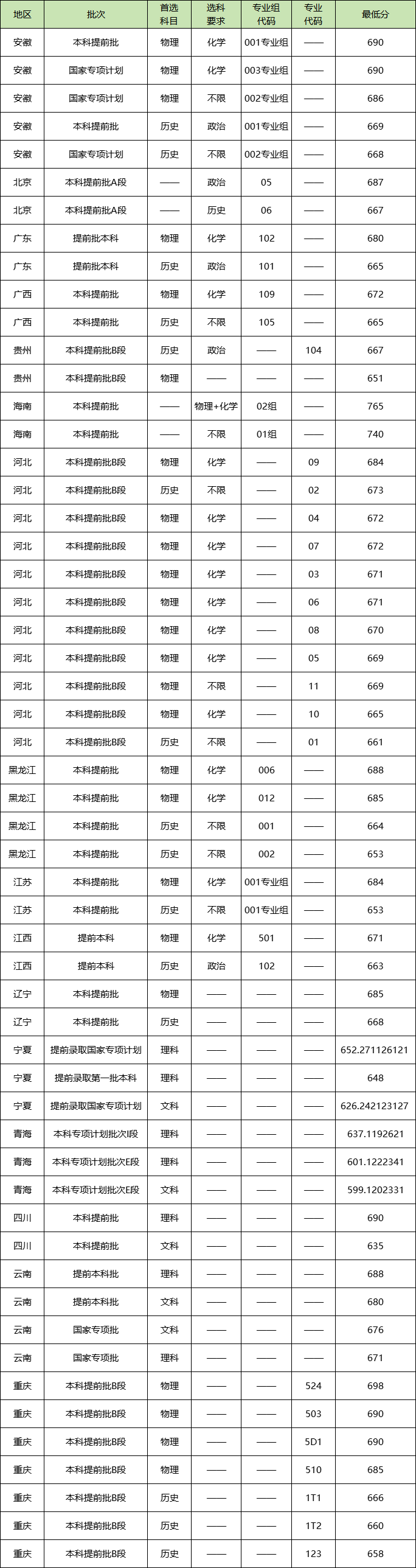 2024年清华大学在各地区本科提前批的录取分数线如下: