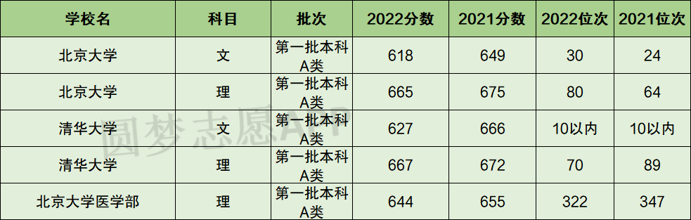 根据山西省教育考试院公布的2022年山西高考本科批分数线,圆梦志愿为大家整理了清华大学、北京大学在山西省的所有分数线,以及清华大学、北京大学近两年在山西省的录取位次。具体数据见下图: