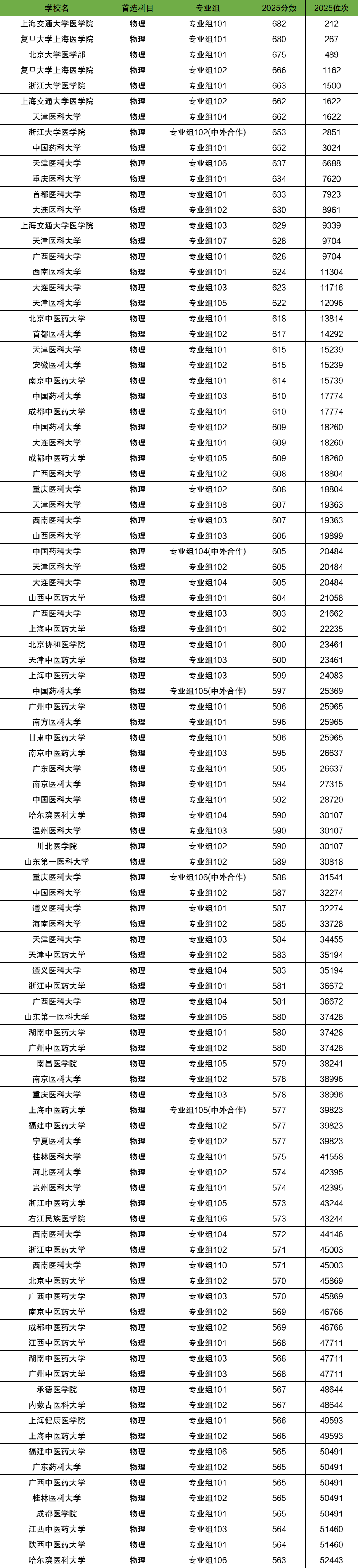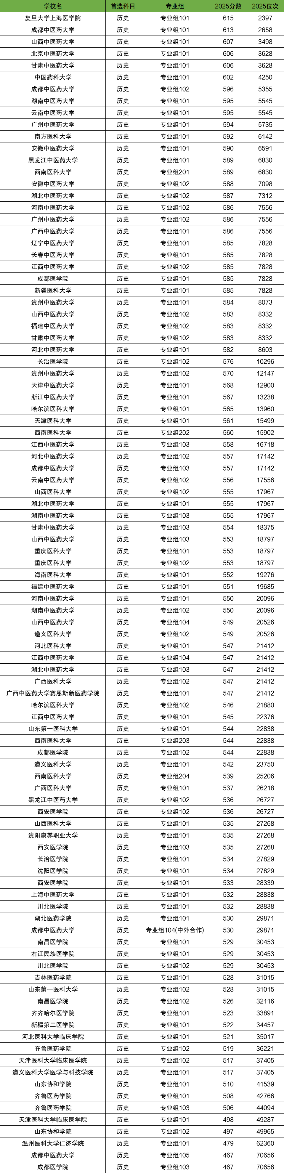 录取分数最高的是复旦大学上海医学院,2025年的投档线是615分,所在的位次是2397;录取分数最低的是成都医学院专业组103、成都中医药大学专业组105,2025年的投档线是467分,所在的位次是70656。