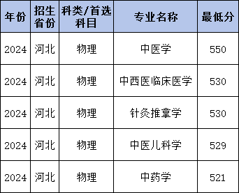 2024年河北中医药大学国家专项计划在河北录取最低分物理类为525分,物理组收分最低的专业为中药学。