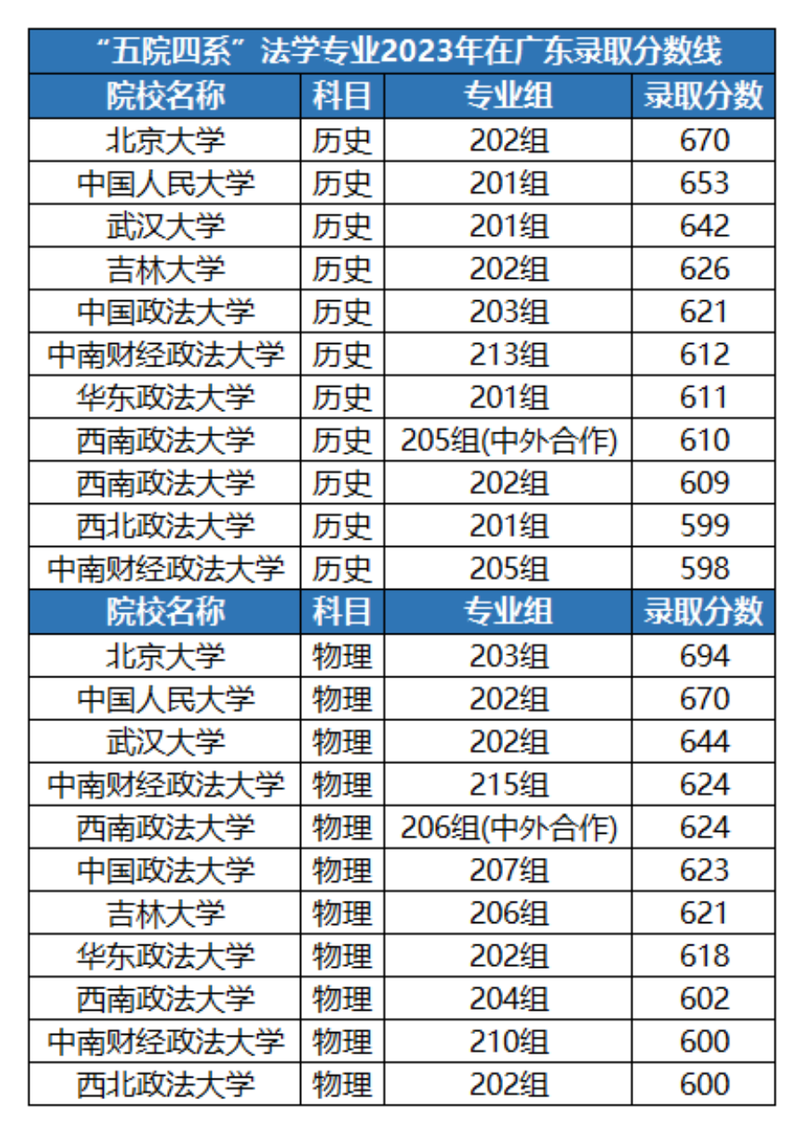 今年面向广东历史类考生招生的五院四系院校中,法学专业录取分数最高的是北大,该校202专业组中包含了法学专业,录取最低分为670分。
