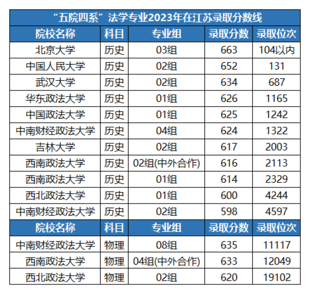 而对于江苏物理类考生来说,录取分数最低的法学专业大学则是西北政法大学,该校法学专业最低投档分数为600分。