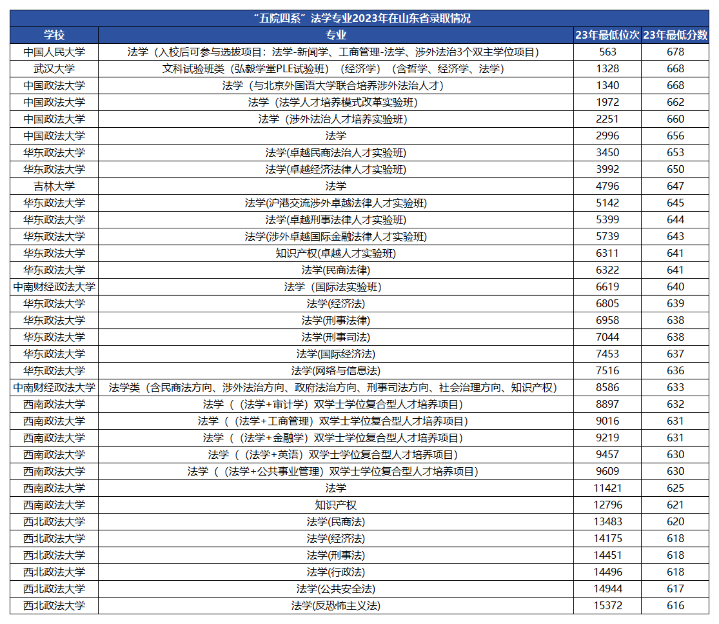 根据“五院四系”法学专业在山东录取情况可以看到,今年在山东招生分数最高的是中国人民大学,该校法学专业2023年的最低分数高达678分,录取位次在全省563名以内。报考人大的法学专业在入校后可以选择3个双主学位项目,包含法学-新闻学、法学-工商管理等项目。