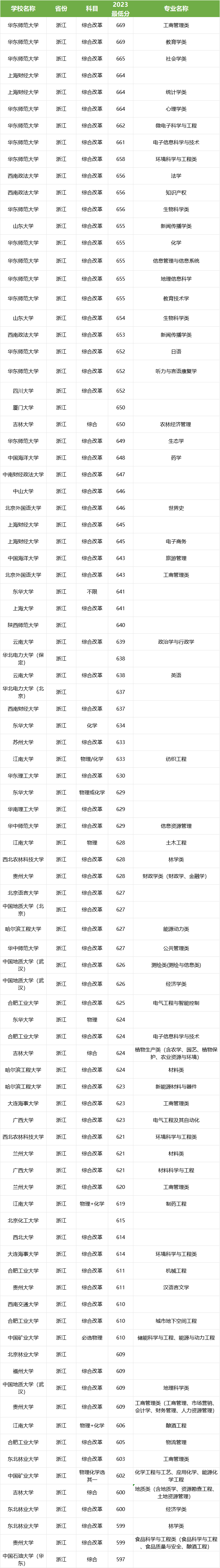 由下表可知,浙江省最低597分能考上高校专项计划大学。各大学在浙江省高校专项招生专业及分数线情况如下: