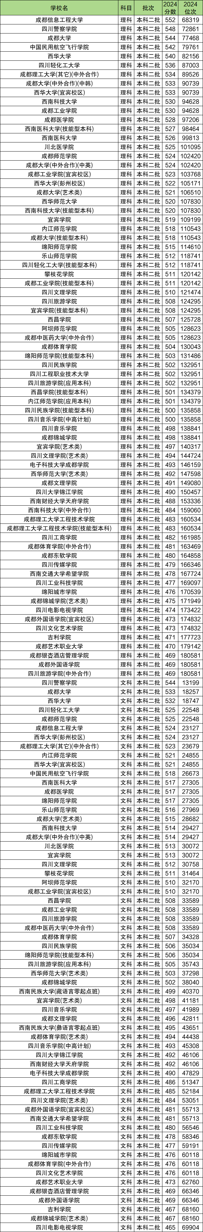 2024年四川二本大学文科录取分数线465分到544分,最低分学校为四川电影电视学院;最高分学校为四川警察学院。