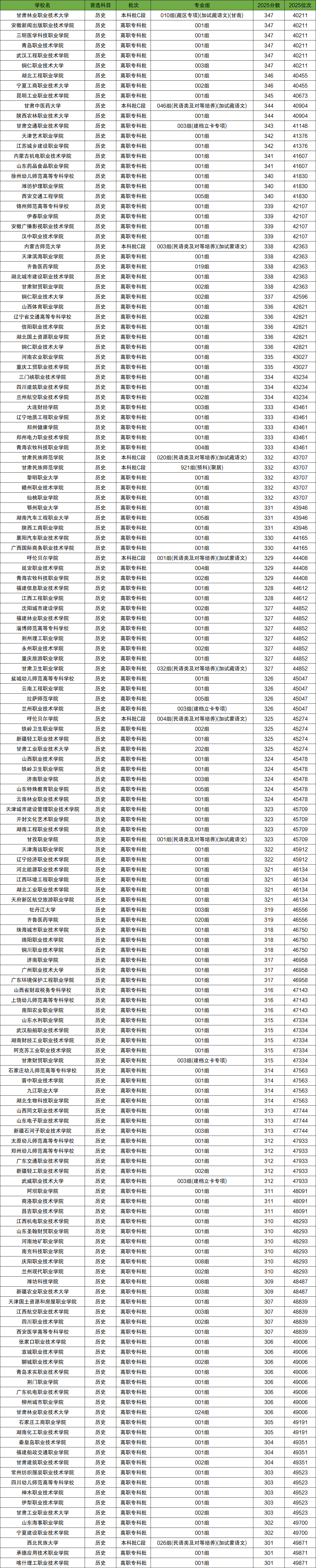 根据甘肃省2025年全国大学录取分数线可知,在1万名之前的历史类考生能上的学校有371所,对应的分数为660~489分,对应位次为36以内~9889位。